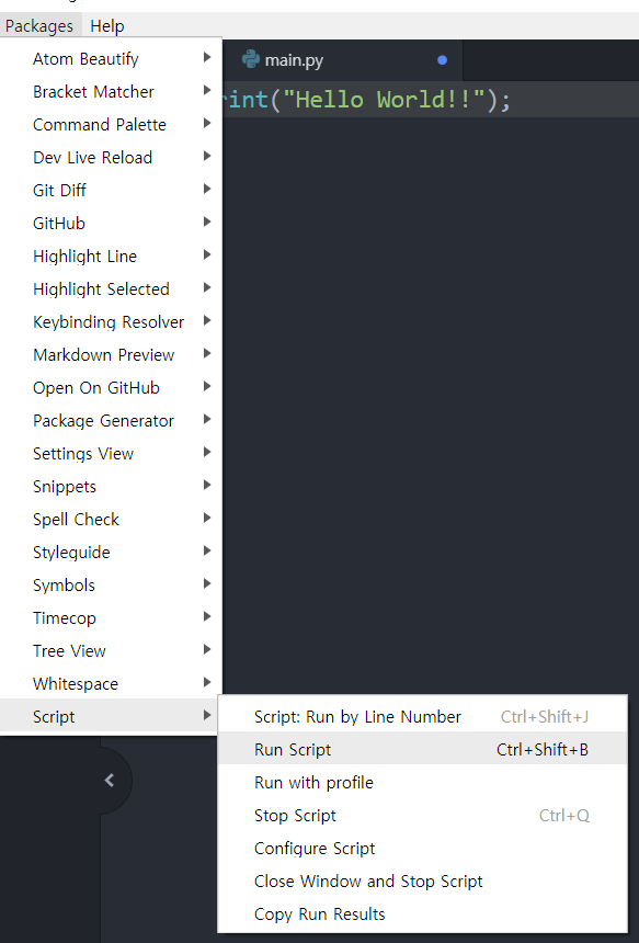 상단 메뉴에서 Packages - Script - Run Script ( 단축키 Ctrl + Shift + B ) 를 누르시면 소스가 실행됩니다.