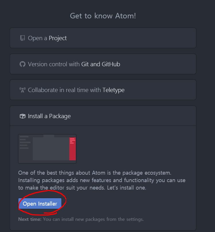 아톰이 설치 완료되면 화면 중앙에 아래와 같은 메뉴가 보입니다.